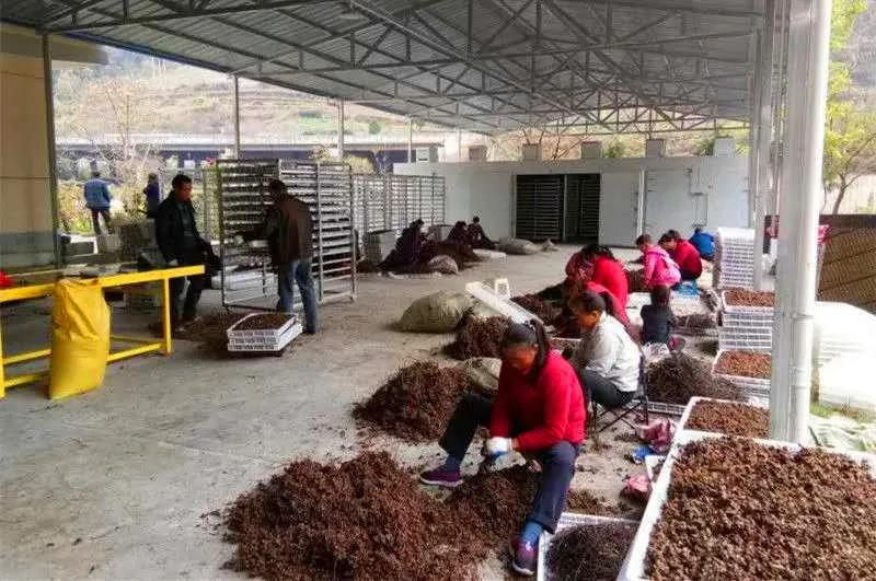 旬阳县易鑫和生态农业农民专业合作社的工人对拐枣进行分拣处理