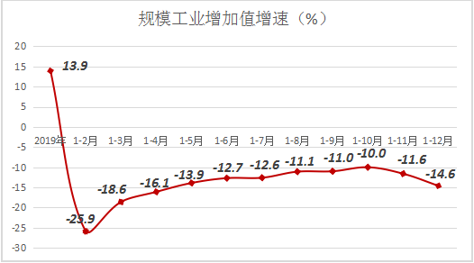 工业经济稳步恢复,但起伏波动较大。2020年,全县规模以上工业完成产值282.74亿元,同比下降19.5%,较上月回落3.8百分点。规模以上工业增加值同比下降14.6%,较上月回落3个百分点,高于全市8.3个百分点,但是从5月以来,回升力度有所减弱,11月份以来再次转为回落,且回落力度有所加大。