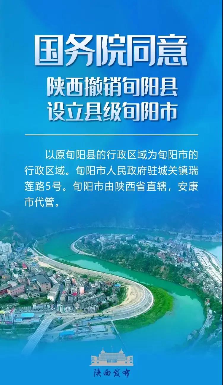 近日,国务院批复同意我省撤销旬阳县,设立县级旬阳市,以原旬阳县的行政区域为旬阳市的行政区域。旬阳市人民政府驻城关镇瑞莲路5号。旬阳市由陕西省直辖,安康市代管。