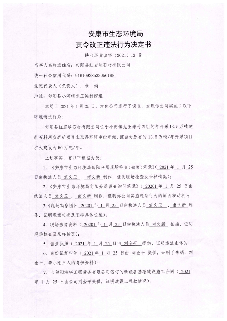 安康市生态环境局责令改正违法行为决定书 陕G环责改字(2021)13号