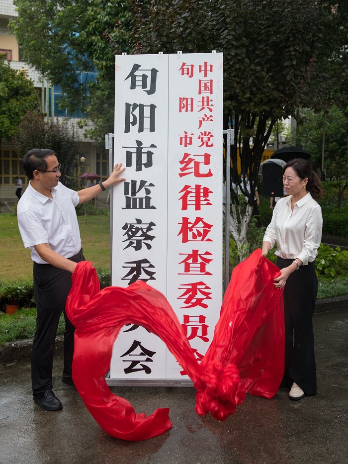 安康市委常委、市纪委书记田沐臣,旬阳市委常委、市纪委书记毛艳绒为“中国共产党旬阳市纪律检查委员会”“旬阳市监察委员会”揭牌
