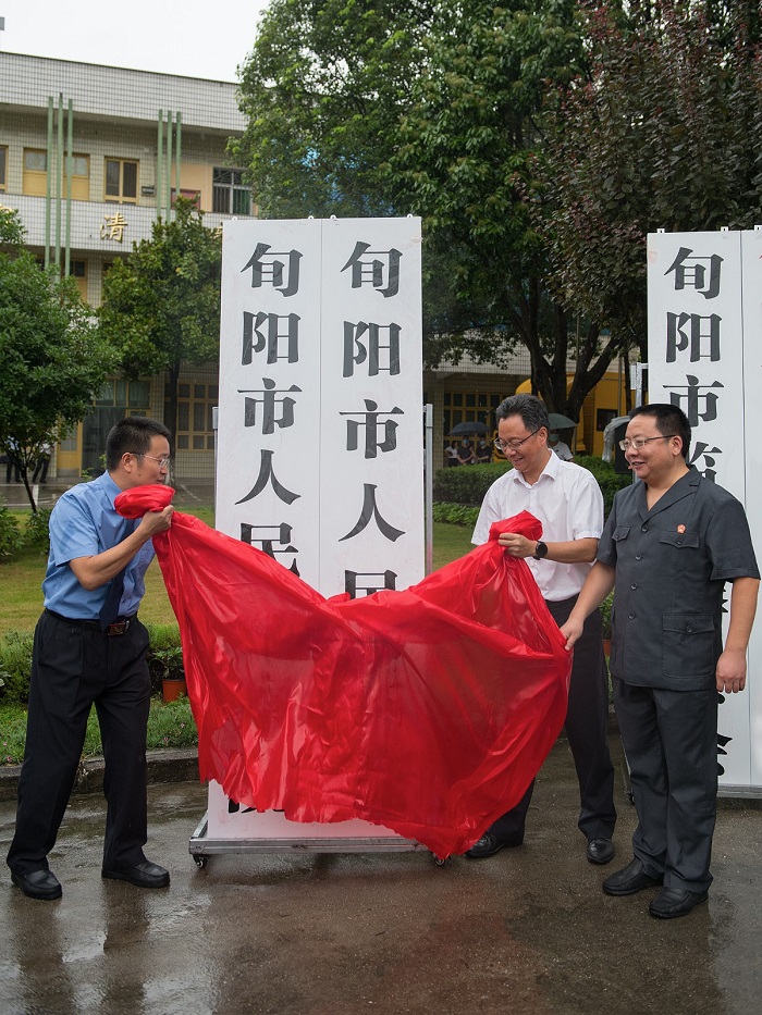 安康市政协副主席梁涛,旬阳市人民法院院长张文远,旬阳市人民检察院检察长屈绳忠为“旬阳市人民法院”“旬阳市人民检察院”揭牌