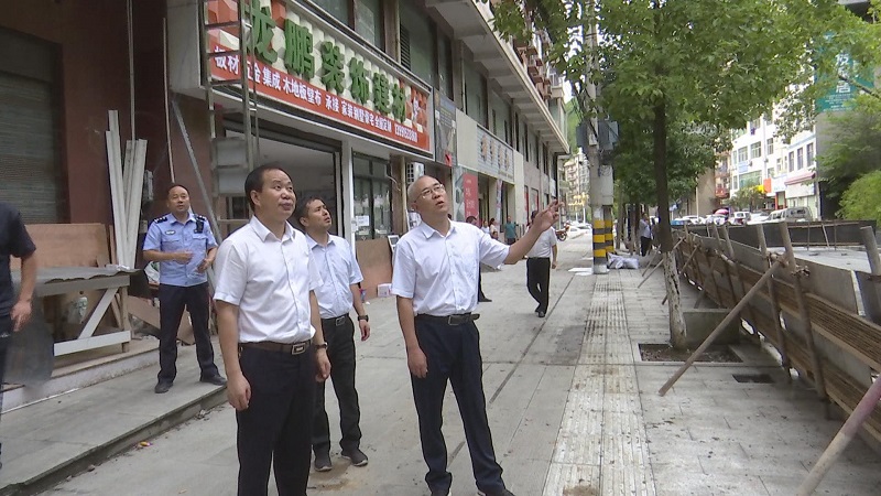 8月31日,旬阳市委副书记、代市长罗本军在城关镇检查防汛防滑工作,市人大常委会副主任熊本奇一同检查。