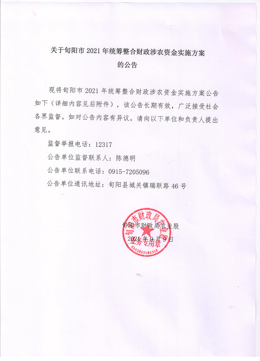 关于旬阳市2021年统筹整合财政涉农资金实施方案的公告