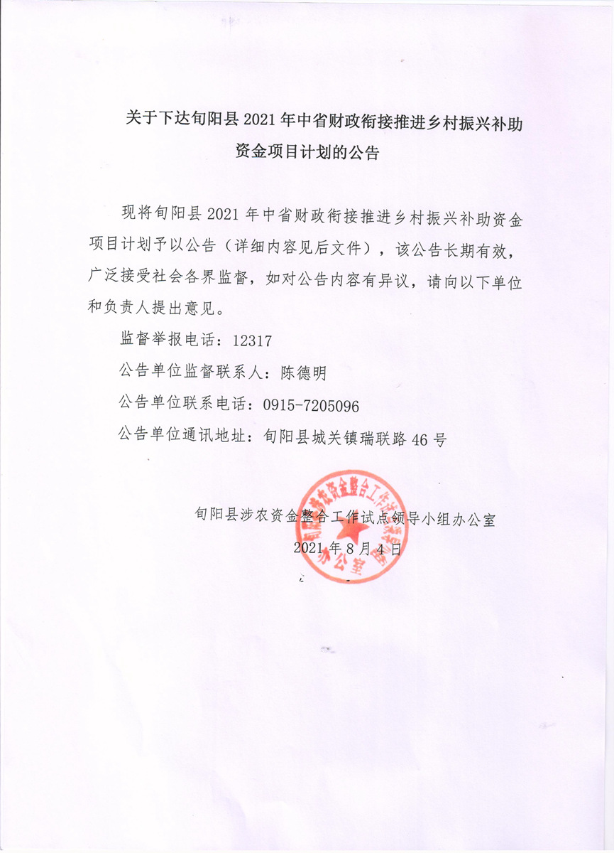 关于下达旬阳县2021年中省财政衔接推进乡村振兴补助资金项目计划的公告