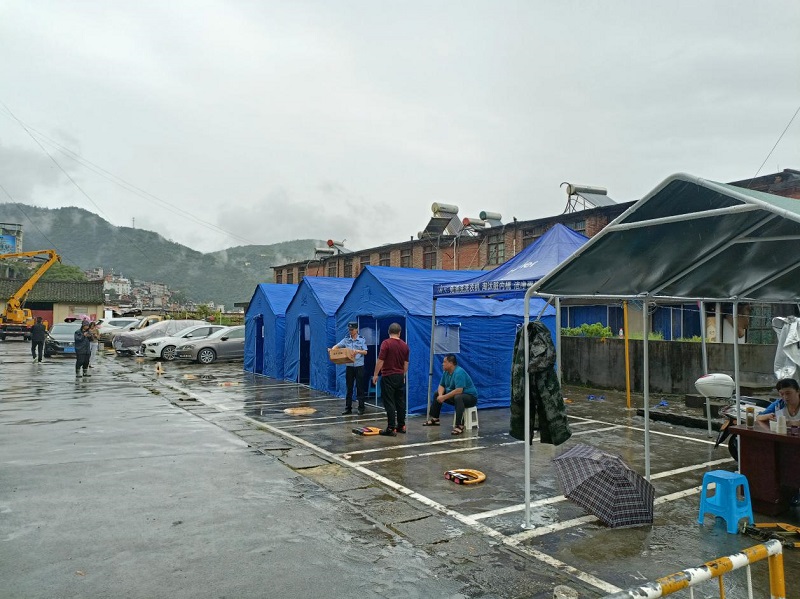 干部冒雨迅速搭建临时帐篷
