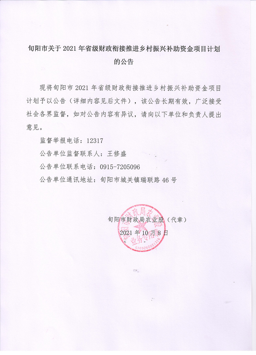关于旬阳市2021年省级财政衔接推进乡村振兴补助资金项目计划的公告