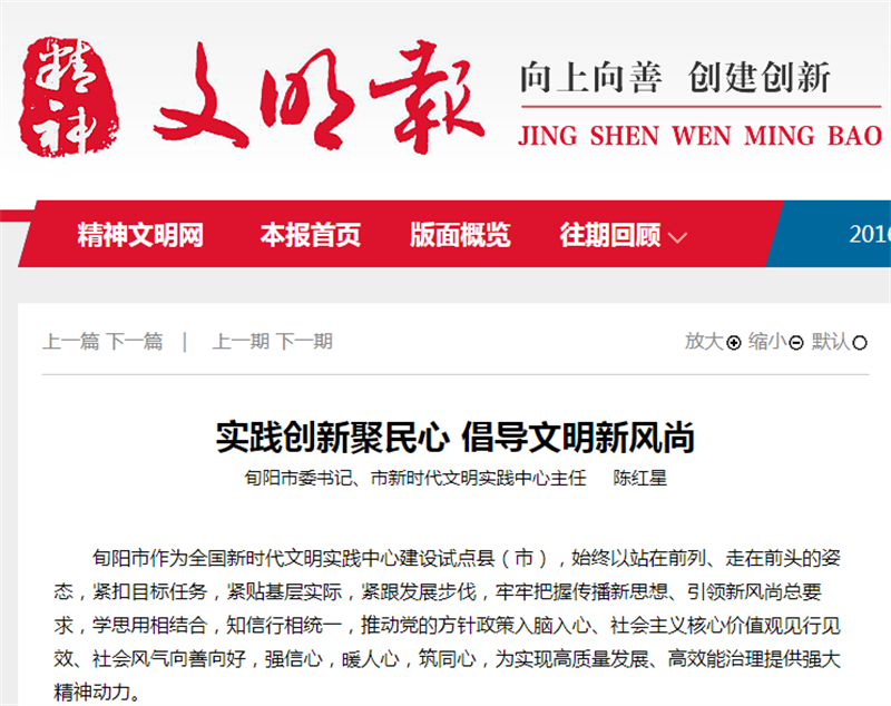 7月12日,旬阳市委书记、市新时代文明实践中心主任陈红星在《精神文明报》头版发表署名文章《实践创新聚民心 倡导文明新风尚》。