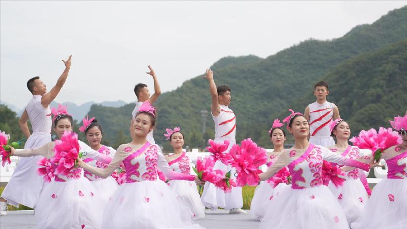 在纯净的背景下,舞蹈《欢天喜地庆秋收》、歌伴舞《开缸酒》、渔鼓道情《生态旅游兴旬阳》、小品《电商助农促丰收》、表演唱《群雁回归兴乡村》、《咱老百姓》、歌舞《追梦绿色向未来》等节目精彩上演, 独特的舞台形式将丰收盛景定格在画卷中,舞者起舞庆丰收,舞出了农人心中的喜悦,传递着农人丰收的幸福。