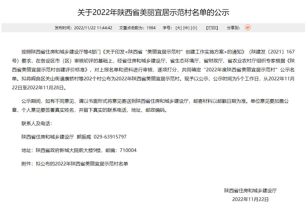 据陕西省住房和城乡建设厅网站消息,11月22日,经省住房和城乡建设厅、省生态环境厅、省财政厅、省农业农村厅组织专家根据《陕西省美丽宜居示范村创建评价标准》评定,共同确定“2022年度陕西省美丽宜居示范村”公示名单。拟将全省202个村公布为2022年陕西省美丽宜居示范村。旬阳市白柳镇老龙沟村、蜀河镇小山岔村、赵湾镇中山村、铜钱关镇铜钱村4个村成功进入公示名单。