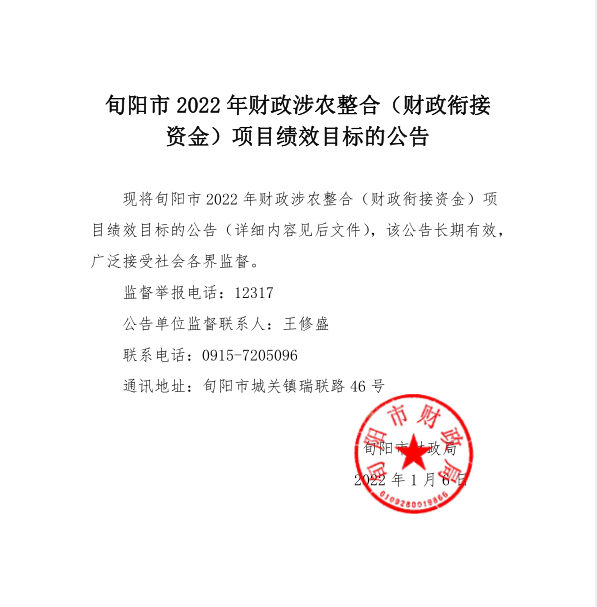 旬阳市2022年财政涉农整合(财政衔接 资金)项目绩效目标的公告