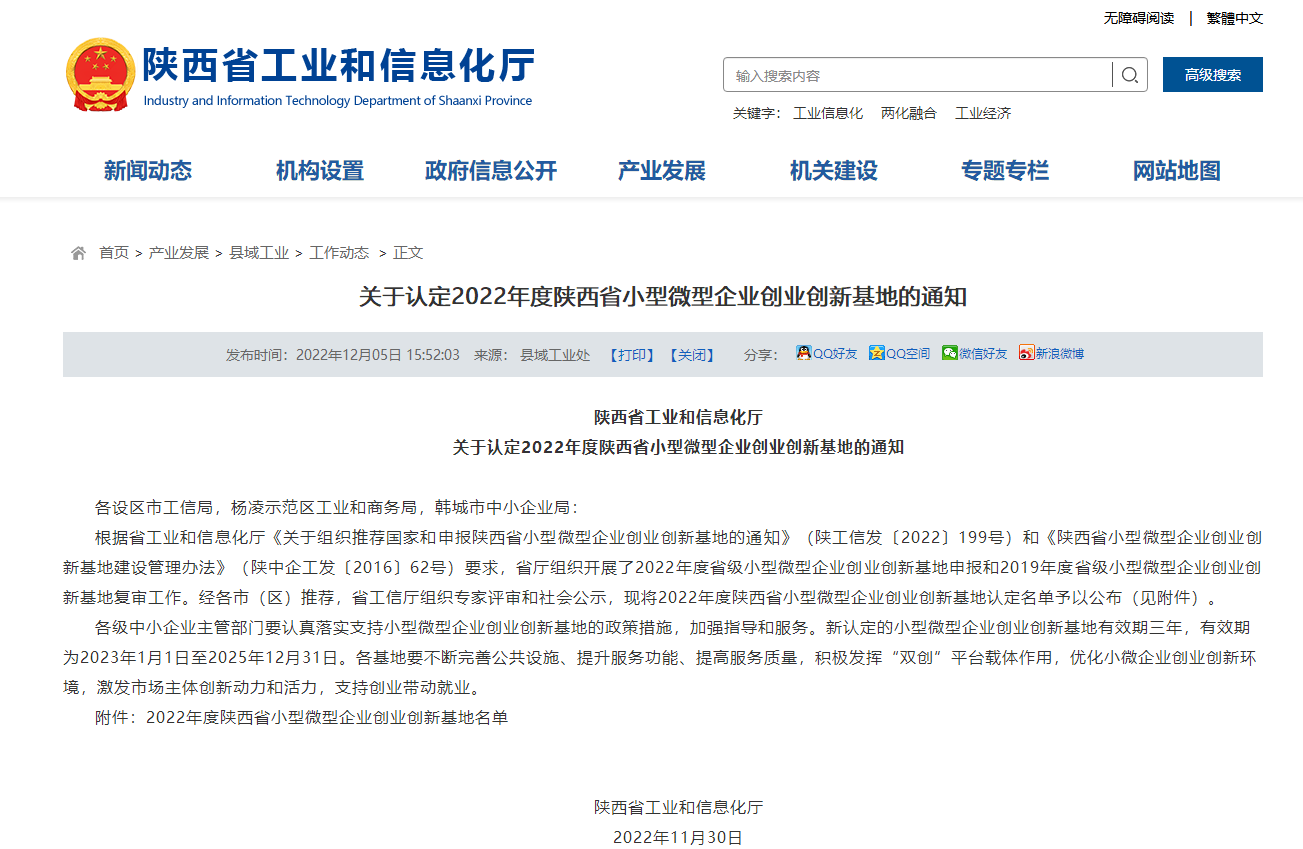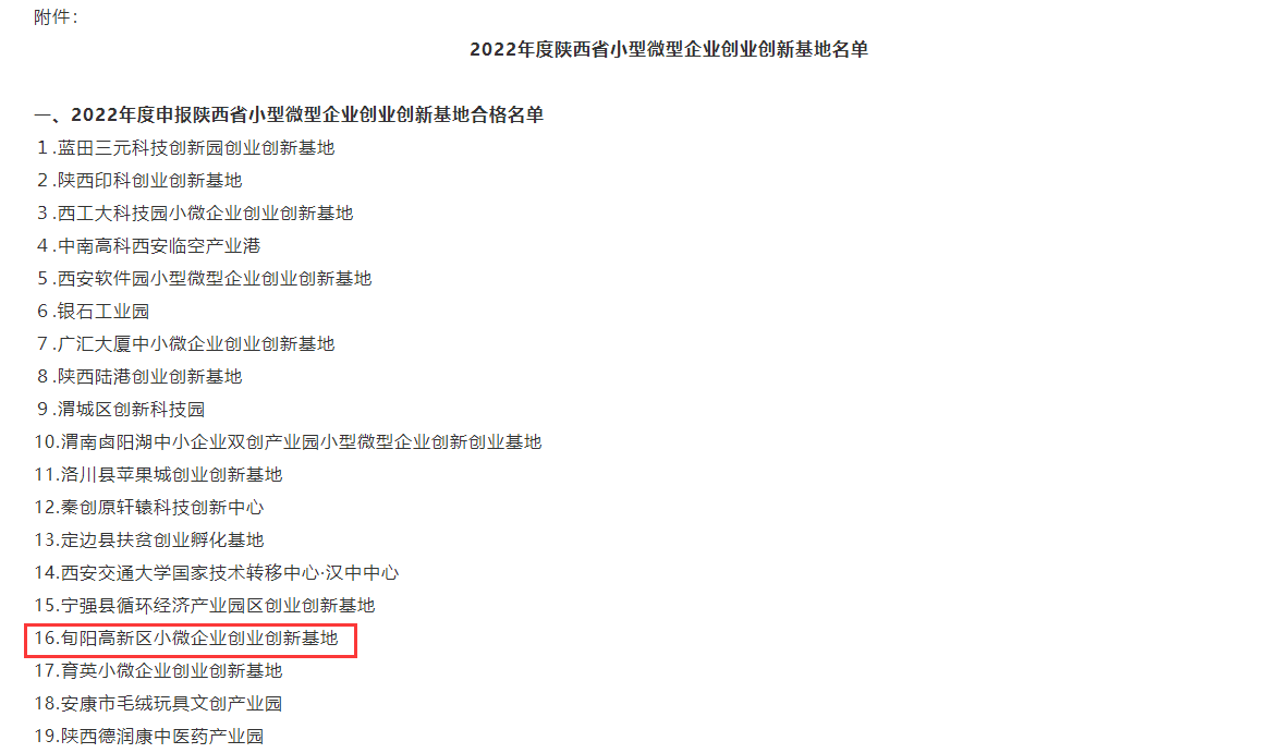 旬阳高新区小微企业创业创新基地入选2022年度陕西省小型微型企业创业创新基地名单