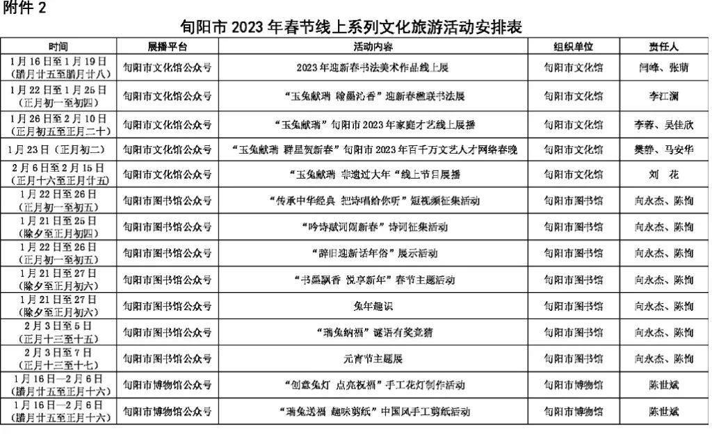 花样迎新年 精彩享不停。本次春节系列文化旅游活动从腊月二十五开始,一直持续到正月十六,从城区到各镇,每天精彩不重样,让你开心过大年。包括春节走基层文艺专场演出、百姓大舞台、优秀文艺社团节目展演、少儿春晚暨旬阳市青少年艺术联盟优秀节目展演、花鼓子、道情皮影、元宵节花灯展、“游文庙·猜灯谜·贺新春”文物法规宣传有奖活动、“多读书·读好书”春节谜语竞猜等线下演出活动及“书墨飘香 悦享新年”、兔年趣识、迎新春书法美术作品展览、“玉兔献瑞 群星贺新春”百千万文艺人才网络春晚、“吟诗赋词闹新春”诗词展示等线上节目(作品)展览展示,还有元宵节主题展“创意兔灯 点亮祝福”手工花灯制作、“瑞兔送福 趣味剪纸”中国风手工剪纸等互动体验活动。