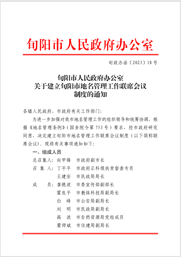 近日,经市政府同意,旬阳市正式建立地名管理工作联席会议制度。