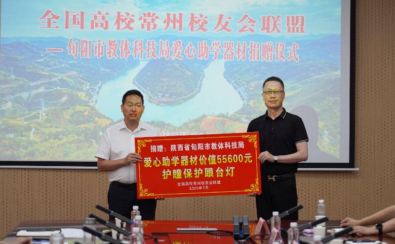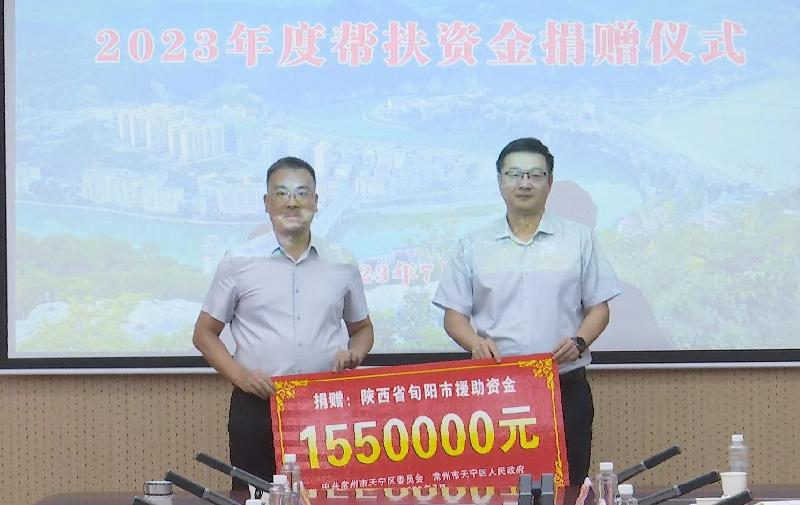 会上,天宁区向旬阳市捐赠援助资金155万元,全国高校常州校友会联盟向旬阳市教体科技局捐赠价值55600元的自然光“护瞳保护眼台灯”,常州市奕迦仁商贸有限公司与旬阳市乡村振兴局签订《苏陕协作消费帮扶农产品采购协议》,江苏苏合名优农产品专业合作联社与旬阳市农业农村局签订《苏陕协作“公司+农户”委托养鹅回购协议》。
