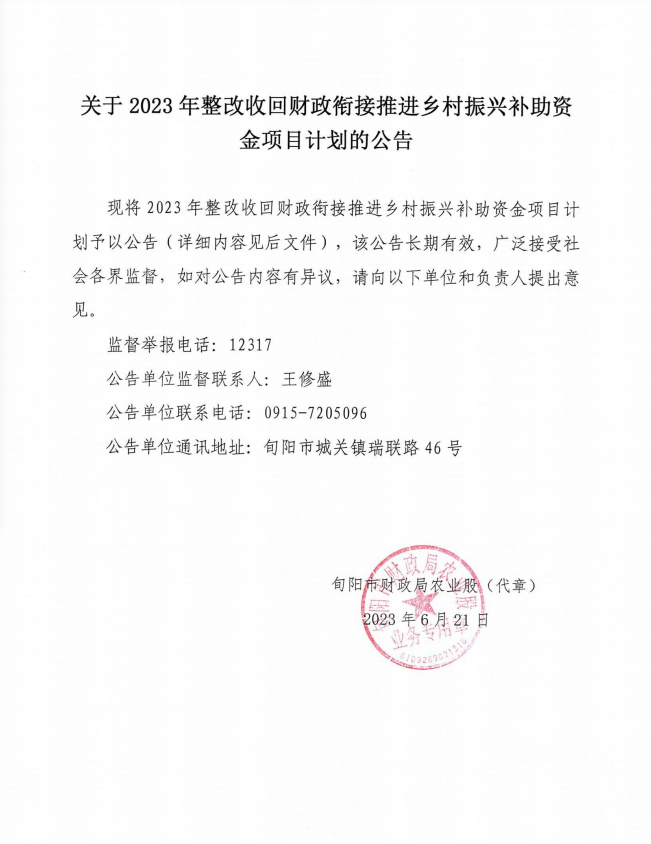 关于2023年整改收回财政衔接推进乡村振兴补助资金项目计划的公告