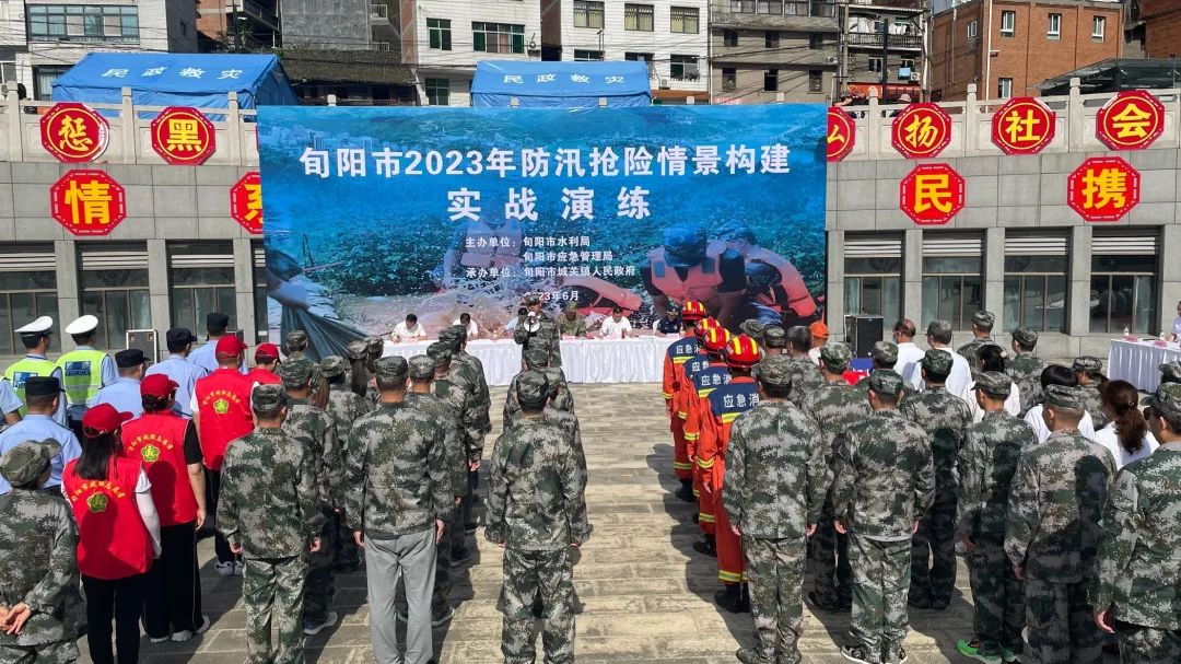 6月14日,旬阳市2023年防汛抢险情景构建实战演练在城关镇老城社区举行,市委常委、副市长杨居侨出席。