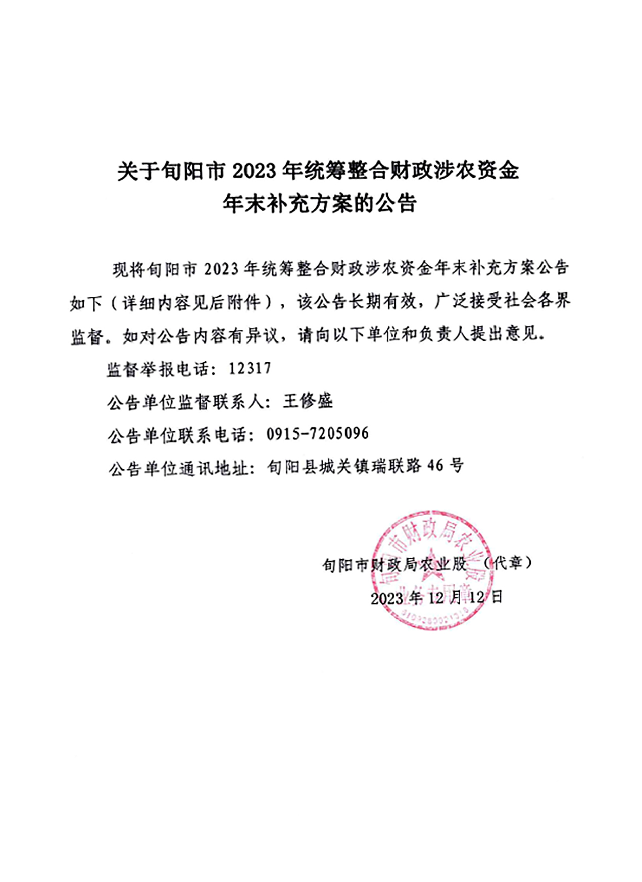 关于旬阳市2023年统筹整合财政涉农资金 年末补充方案的公告