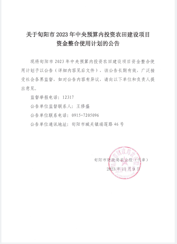 关于旬阳市2023年中央预算内投资农田建设项目 资金整合使用计划的公告
