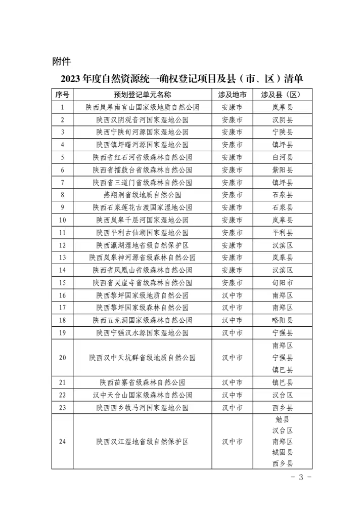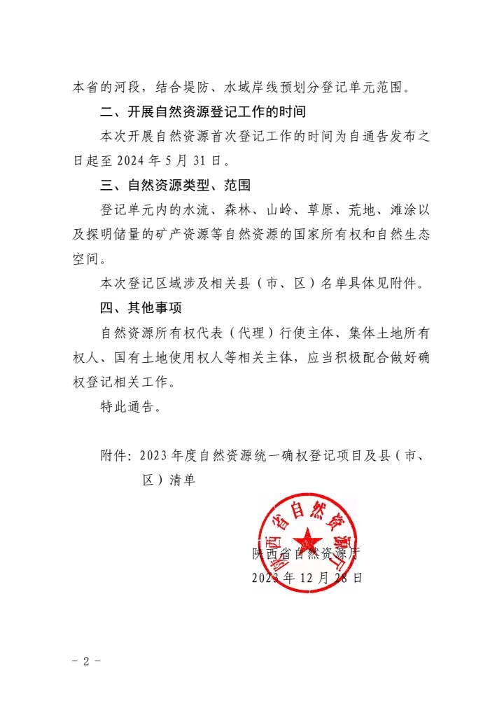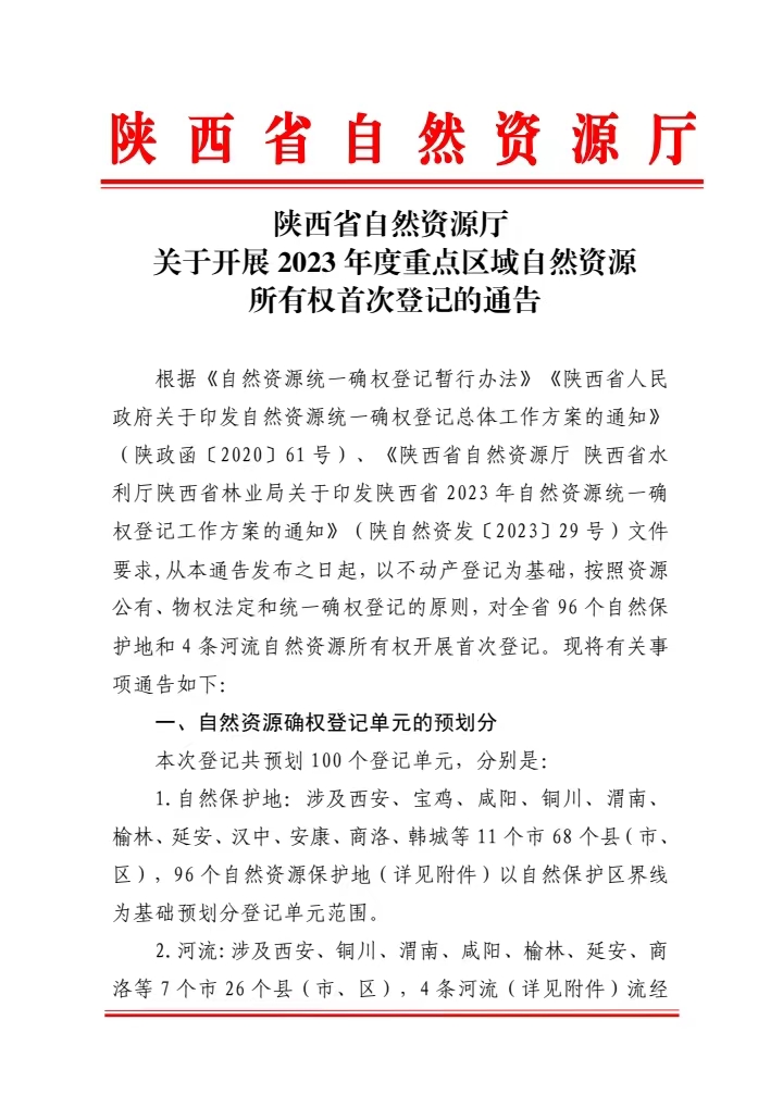 陕西省自然资源厅 关于开展 2023 年度重点区域自然资源 所有权首次登记的通告