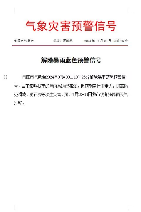 解除暴雨蓝色预警信号