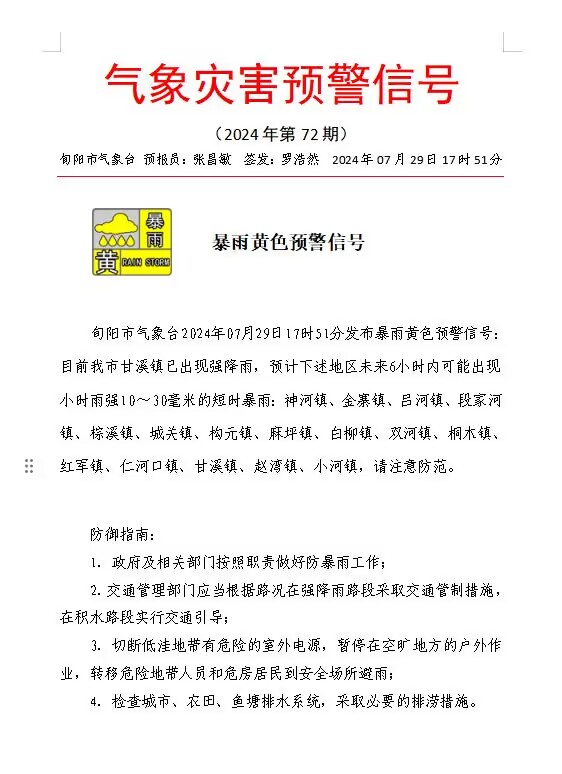 2024年07月29日19时08分升级发布暴雨橙色预警信号