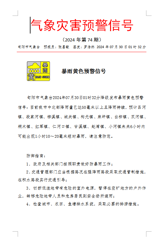 2024年07月30日01时32分降级发布暴雨黄色预警