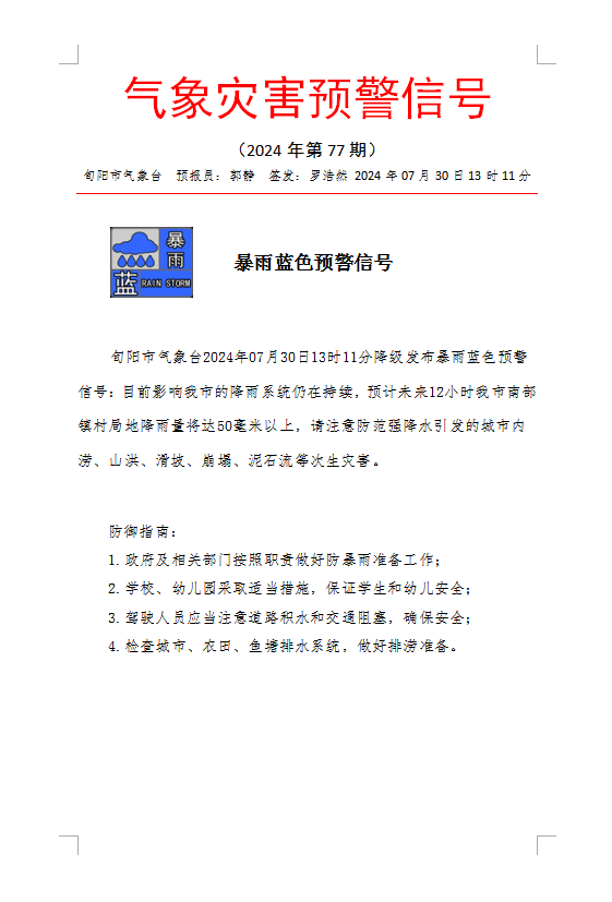 2024年07月30日07时43分降级发布暴雨黄色预警信号
