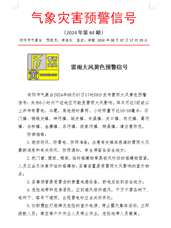 2024年08月07日17时39分发布雷雨大风黄色预警信号