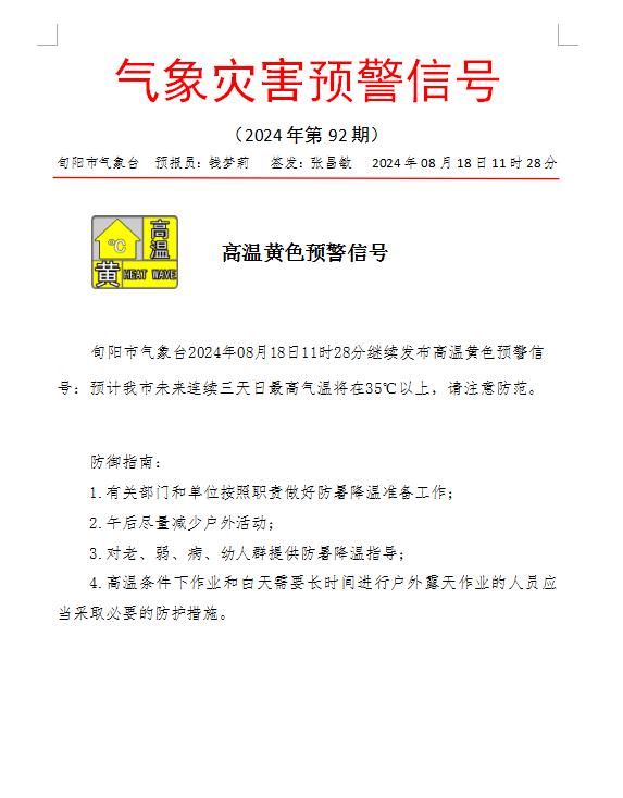 旬阳市气象台2024年08月18日11时28继续发布高温黄色预警信号