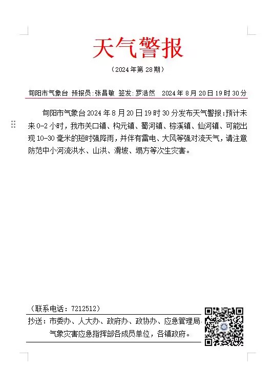 2024年8月20日19时30分发布天气警报