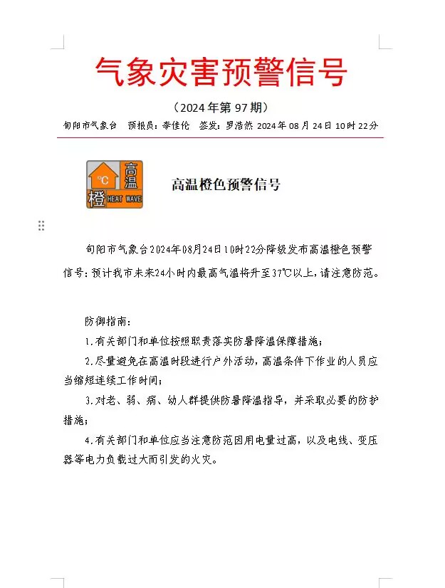 2024年08月24日10时22分降级发布高温橙色预警信号