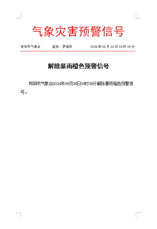 旬阳市气象台2024年08月25日23时26分发布暴雨橙色预警信号