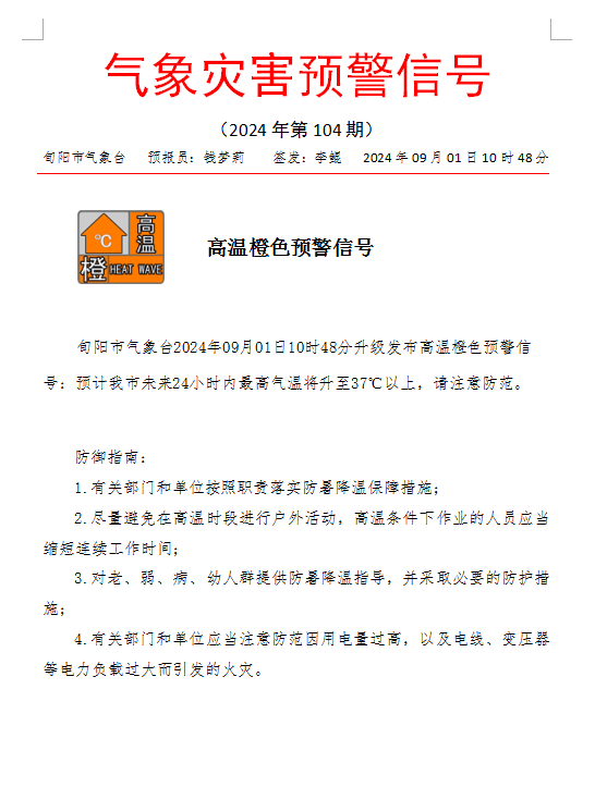 2024年09月01日10时48分升级发布高温橙色预警信号