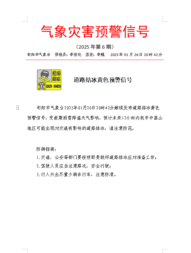 2025年1月26日20时42分继续发布道路结冰黄色预警信号