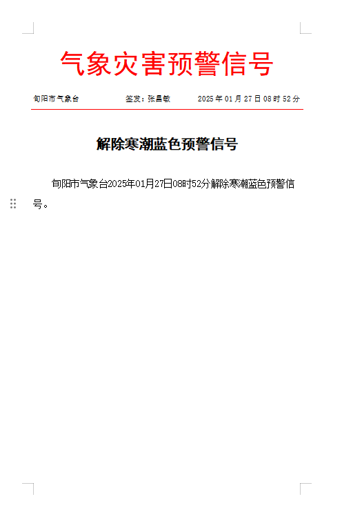 2025年01月27日08时52分解除寒潮蓝色预警信号