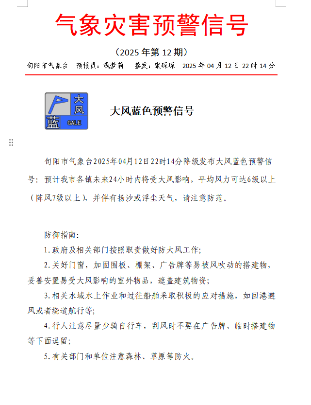 旬阳市气象台2025年04月12日22时14降级发布大风蓝色预警信号