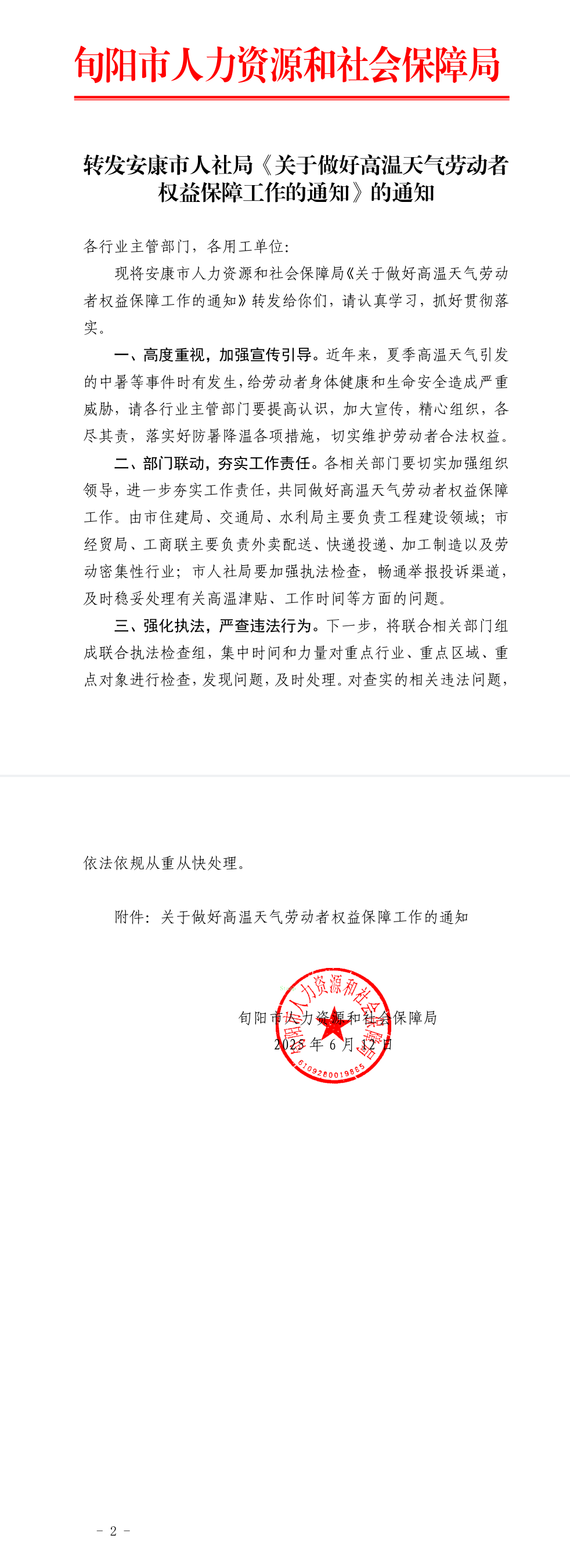 转发安康市人社局《关于做好高温天气劳动者权益保障工作的通知》的通知